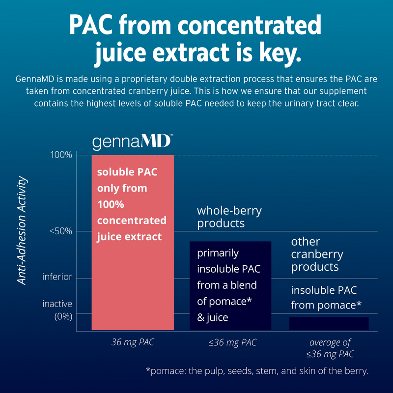The quality of the PAC, which is directly related to the manufacturing process, matters. GennaMD is made by using an advanced double extraction process that ensures the PAC are takenonlyfrom cranberry juice extract.