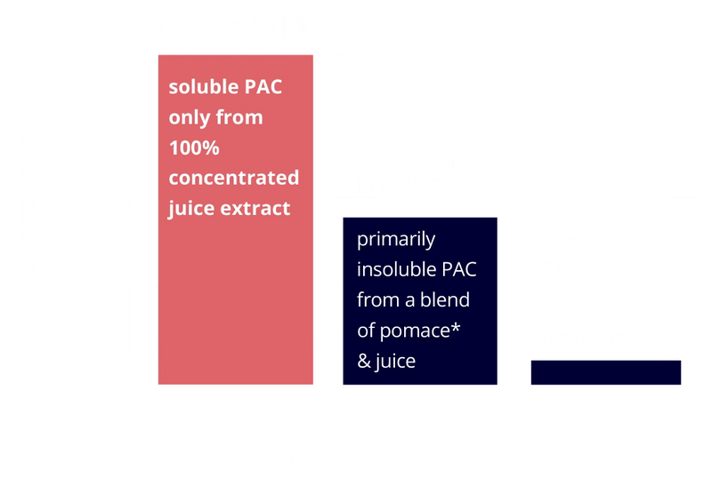 Only the PAC that come from concentrated juice extract have this power, because they are 100% soluble.The PAC in other urinary tract supplements come from the pomace (the skin, seeds, stems, and pulp of the berry) and pomace is not soluble, and therefore not effective.